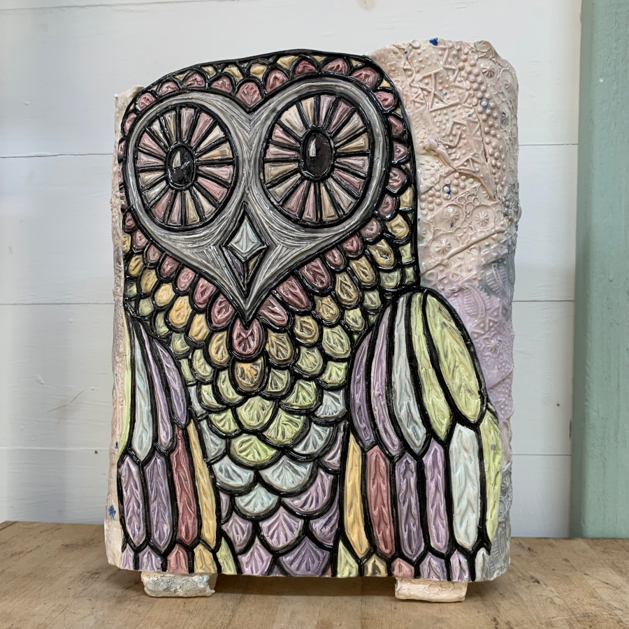 The owl element is decorated using a mix of underglazes and coloured glazes with a clear glaze over the top, the back is decorated with a mix of coloured glazes.