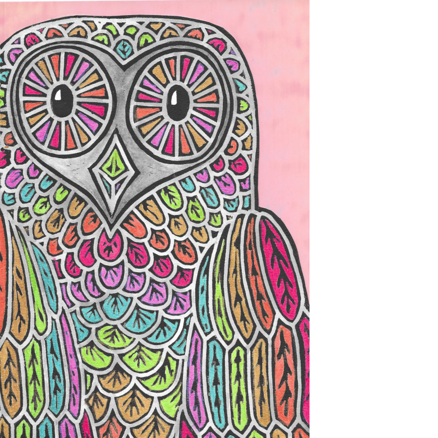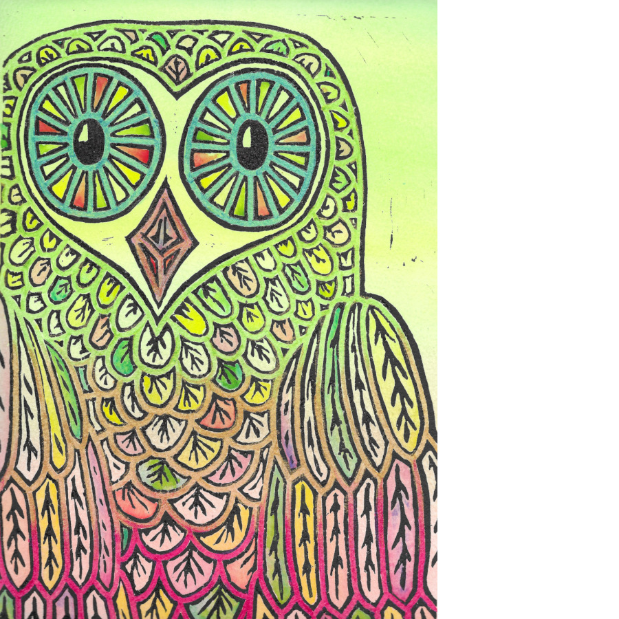 Unique, original hand-painted lino-cut print of an owl. (This print block is also used on my Printed Owl Vases).